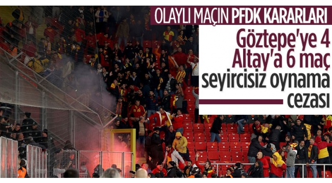 Türkiye Futbol Federasyonu (TFF) Profesyonel Futbol Disiplin Kurulu (PFDK), Göztepe-Altay maçında yaşananlardan dolayı Göztepe'ye 4 maç, Altay'a ise 6 maç seyircisiz oynama cezası verdi.