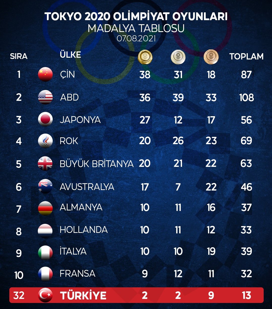 Tokyo 2020'de 15. gün sonunda madalya tablosunun zirvesindeki 10 ülkenin ve Türkiye'nin madalya sayısı şöyle: