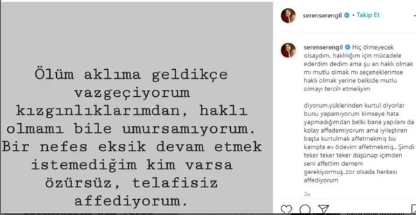 Serengil "Ölüm aklıma geldikçe kızgınlıklarımdan vazgeçiyorum" notunun olduğu fotoğrafa şunları yazdı: