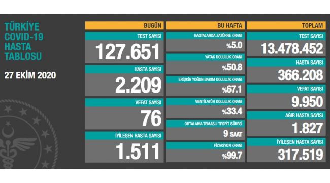 Sağlık Bakanlığının Covid-19 bilgilendirme sayfasında Türkiye'nin güncel korona virüs tablosu kamuoyuyla paylaşıldı. Tabloya göre son 24 saatte 76 kişi korona virüsten hayatını kaybetti, toplam can kaybı 9 bin 950'e yükseldi. Bugün toplam 127 bin 651 test yapılırken, 2 bin 209 yeni vaka tanısı konuldu. Toplam vaka sayısı 356 bin 208 oldu. Bugün iyileşen bin 511 kişiyle birlikte toplam iyileşen toplam hasta sayısı 317 bin 519'e yükseldi. Toplam hastalarda zatürre oranının yüzde 5,0, toplam ağır hasta sayısının ise bin 827 olduğu açıklandı.