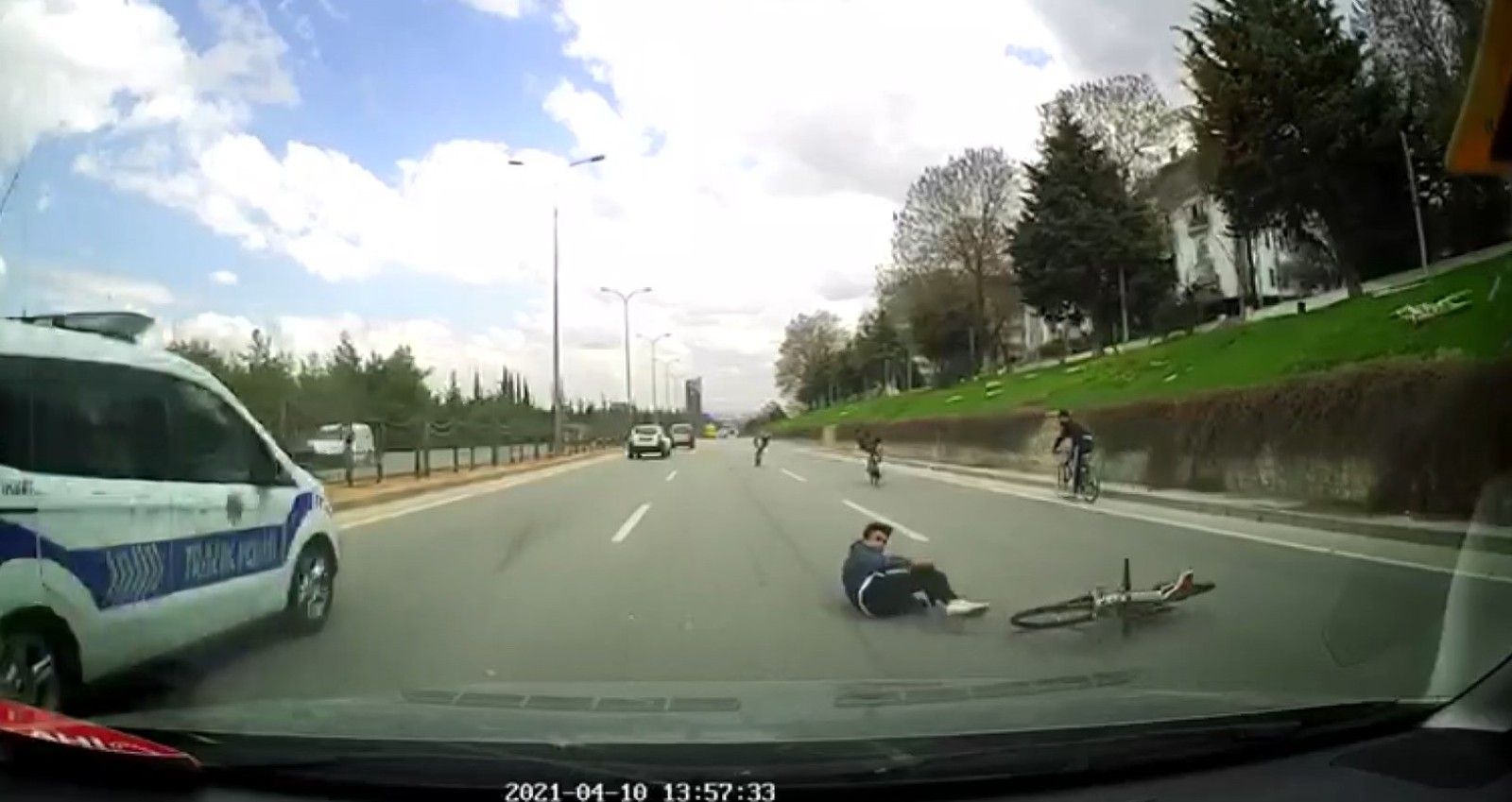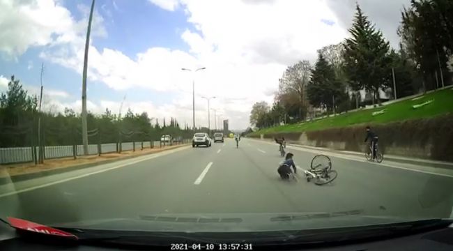 O esnada haberden dönen İhlas Haber Ajansı'nın ekibinin önünde dengesini kaybeden bisikletli gençlerden biri yolun ortasına düştü. Arkadan gelen İHA ekibinin aracıda, düşen genci fark ederek son anda durdu. O anlar ise, hem araç kamerasına hem de gençleri fark ederek çekmek isteyen İHA muhabirinin kamerasına an be an yansıdı.