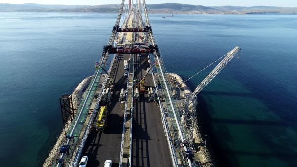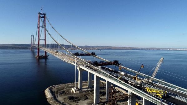 Çanakkale Boğazı'nda Avrupa ve Asya kıtalarını ilk kez birbirine bağlayan ve Cumhuriyet'in 100'üncü yılını simgeleyen, 2023 metrelik orta açıklığıyla da 'dünyanın en uzun orta açıklıklı asma köprüsü' unvanını alan 1915 Çanakkale Köprüsü'nün açılışı için gün sayılıyor. Köprünün araç geçiş yolunda asfaltlama çalışmalarına hızla devam ediliyor. Lapseki yakasındaki 680 metrelik ve Gelibolu yakasındaki 365 metrelik yaklaşım viyadüklerinde asfaltlama çalışmaları tamamlandı. Cumhuriyet'in 100'üncü yılını simgeleyen köprünün kenar açıklıklarıyla 2023 metrelik orta açıklığında asfaltlama çalışmalarına geçildi. Köprüde, yaklaşım viyadükleriyle toplam 4 bin 608 metre uzunluğunda yol asfaltlanmış olacak. Şubat ayı sonuna kadar hizmet vermeye hazır hale getirilmesi planlanan köprünün açılışının da Çanakkale Deniz Zaferi'nin 107'nci yılının kutlanacağı 18 Mart'ta, Cumhurbaşkanı Recep Tayyip Erdoğan tarafından yapılması planlanıyor. Çanakkale Boğazı'nda araçların bir kıtadan diğerine 6 dakika gibi kısa sürede geçişine imkan tanıyacak 1915 Çanakkale Köprüsü, ulaşım sorununu çözmenin yanı sıra hem Çanakkale hem de ülke ticaretine katkı sağlayacak.
