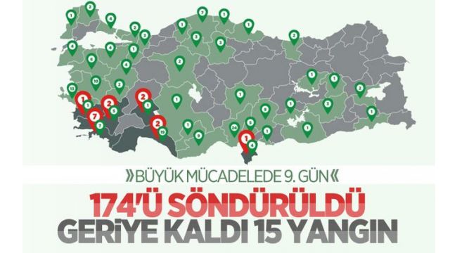 İletişim Başkanı Fahrettin Altun, 189 bölgede çıkan 174 yangının kontrol altına alındığını, 15 bölgedeki söndürme çalışmalarının devam ettiğini açıkladı.