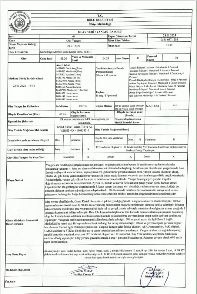 Kartalkaya Kayak Merkezi'ndeki Grand Kartal Otel'de 21 Ocak Salı günü 03.30'da çıkan ve 78 kişinin ölümüne sebep olan yangına ilişkin Bolu Belediyesi İtfaiye Müdürlüğünce hazırlanan olay yeri yangın raporu ortaya çıktı.