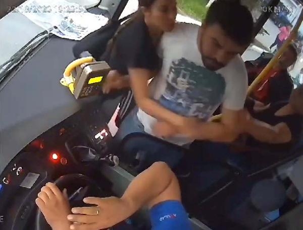 AYDIN'da belediye otobüsü şoförü Mürşit Şenocak, fazla yolcu alma nedeniyle tartıştığı kadın yolcununu yanındaki Mehmet Y.'nin saldırısına uğradı. Darbedilen şoför Şenocak'ın şikayeti üzerine Mehmet Y., gözaltına alındı. Olay, otobüs kamerasına yansıdı.