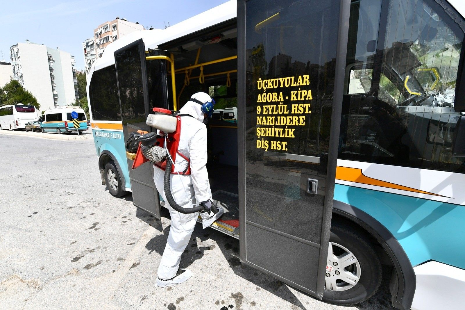 Korona virüs salgınıyla mücadelede İzmir Büyükşehir Belediye Başkan Tunç Soyer'in başlattığı "Kriz Belediyeciliği" uygulamaları doğrultusunda kentte kapsamlı bir çalışma yürüten İzmir Büyükşehir Belediyesi, kamuya açık alanlarda dezenfeksiyon çalışmalarını aralıksız sürdürüyor. Özellikle yurttaşların yoğun olarak kullandığı otobüsler, taksi ve dolmuşlarda hijyen ve temizliğe büyük önem veriliyor. İzmir Büyükşehir Belediyesi Çevre Koruma ve Kontrol Şube Müdürlüğü ekiplerince otobüs aktarma merkezlerinde otobüsler sabah saatlerinde sefere çıkmadan önce ve gün içinde olmak üzere en az iki kez dezenfekte ediliyor. Ekipler kendi bölgelerinde dolmuş ve taksi duraklarını gezerek kesintisiz hizmet verirken, haftanın beş günü İzmir Şoförler ve Esnaf Odası önünde taksiler düzenli olarak dezenfeksiyon işlemine tabi tutuluyor. Geçen yıldan bu yana 367 bin noktada dezenfeksiyon çalışmasını tamamlayan İzmir Büyükşehir Belediyesi Çevre Koruma ve Kontrol Şube Müdürlüğü ekipleri tam kapanma sürecinde de çalışmalarına kesintisiz devam ediyor.