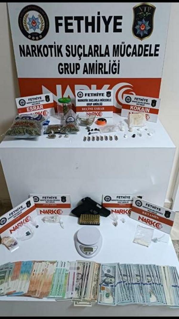 Muğla İl Emniyet Müdürlüğü Narkotik Suçlarla Mücadele Şubesi ekipleri, Dalaman ve Fethiye ilçelerinde piyasaya uyuşturucu madde sürüleceği bilgisine ulaştı. Harekete geçin ekipler, yapılan teknik ve fiziki takibin ardından, şüphelilerin ev ve iş yerlerine operasyon düzenlendi. Adreslerde yapılan aramalarda, otomobil anahtarı içerisine gizlenmiş vaziyette esrar ile çok miktarda satışa hazır paketler halinde uyuşturucu madde, 1 hassas terazi, 1 ruhsatsız tabanca, 50 mermi, ve uyuşturucu satışından elde edildiği değerlendirilen 4 bin 700 lira, 5 bin 800 dolar, 3 bin euro ele geçirildi. Gözaltına alınan D.C., E.K., B.D., S.B., ile G.P.'nin işlemlerinin sürdüğü bildirildi. (DHA)