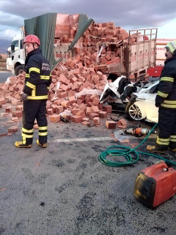 Kaza, saat 07.30 sıralarında, İzmir-Ankara yolu Bağyurdu Organize Sanayi Bölgesi kavşağında meydana geldi. İzmir'den Turgutlu yönüne giden Serhat Kesgin yönetimindeki 09 AHN 898 plakalı otomobil, Bağyurdu ova yolundan kara yoluna çıkan Oğuz T.'nin (30) kullandığı 45 ABV 591 plakalı tuğla yüklü kamyona yandan çarptı. Çarpmanın şiddetiyle ön kısmı hasar gören otomobilde, sürücü Kesgin sıkıştı. Çevredekilerin ihbarı üzerine kaza yerine itfaiye, sağlık ve polis ekipleri yönlendirildi. Kesgin, sıkıştığı yerden itfaiye ekiplerince çıkarıldı. Sağlık ekipleri, yaptığı kontrolde, Kesgin'in hayatını kaybettiği belirledi. Polis, kazayla ilgili soruşturma başlattı. (DHA)
