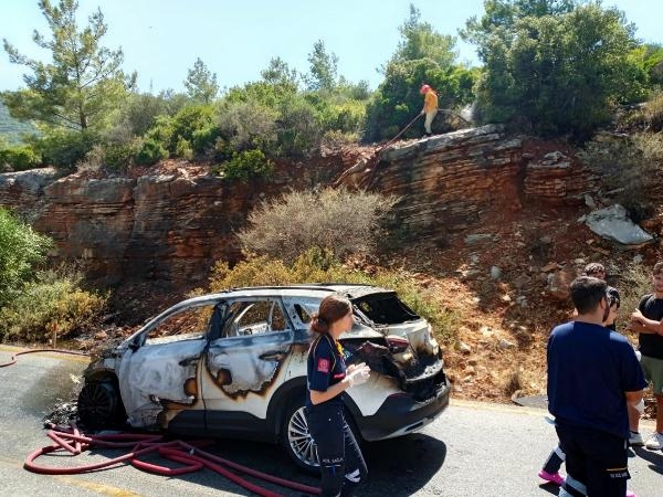 MUĞLA'nın Bodrum ilçesinde, seyir halindeki otomobil, bir anda alev aldı. Kısa sürede gelen itfaiye ekipleri, alevler yol kenarındaki ormana sıçramadan yangını söndürdü.