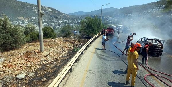 Olay, saat 15.00 sıralarında meydana geldi. Türkbükü'nden Torba Mahallesi yönüne giden E.T.'nin kullandığı 34 DTG 551 plakalı kiralık otomobil, seyir halindeyken bir anda alev aldı. Alevler kısa sürede tüm otomobili sardı. Otomobilin sürücüsü E.T., hemen yolun sağında durup, eşiyle birlikte araçtan indi. İhbar üzerine gelen itfaiye ekipleri alev topuna dönen otomobile su sıkarak müdahale etti. Alevler, yol kenarındaki ormana sıçramadan söndürülürken, otomobil kullanılmaz hale geldi. Alevlerin söndürülmesinin ardından yarım saat kadar trafiğe kapalı kalan yol, tekrar normal seyrine döndü.(DHA)