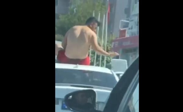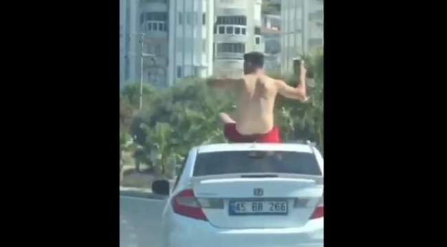 Manisa'dan Kuşadası'na tatile gelen arkadaşlar S.K. ile A.G.'nin tehlikeli yolculuğu hem kendilerinin hem de trafikteki diğer sürücülerin güvenliğini tehlikeye attı. Kuşadası Candan Tarhan Bulvarı üzerinde seyir halindeki 45 BB 266 plakalı otomobilin tavanına oturan, bir elinde bira şişesi ve sigarası olan yarı çıplak kişiyi görenler o anları önce kayda aldı, ardından polise bildirdi. Daha sonra ise kaydettikleri görüntüleri sosyal medyada paylaştı.