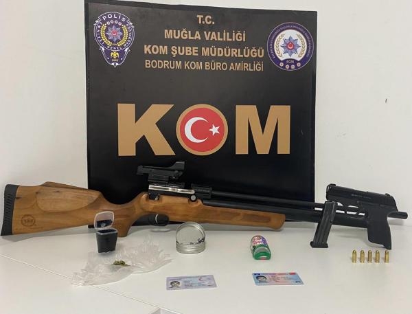 Bodrum Kaçakçılık ve Organize Suçlarla Mücadele Büro Amirliği ekipleri, uyuşturucu ve silah kaçakçılığı yaptığı öne sürülen bir şüpheliyi takibe aldı. Ekipler, şüphelinin otomobilini Bitez Mahallesi Adliye arkasında sıkıştırdı. Polisten kaçmak için manevra yapan şüpheli, çöp konteynerlerine çarptı. Otomobilden inen şüpheli, yaya olarak kaçmaya başladı. KOM ekipleri 'dur' ihtarında bulundukları V.A., kaçmaya devam edince uyarı ateşi yapıldı. Şüpheli polis ekibi tarafından yakalanarak gözaltına alındı.