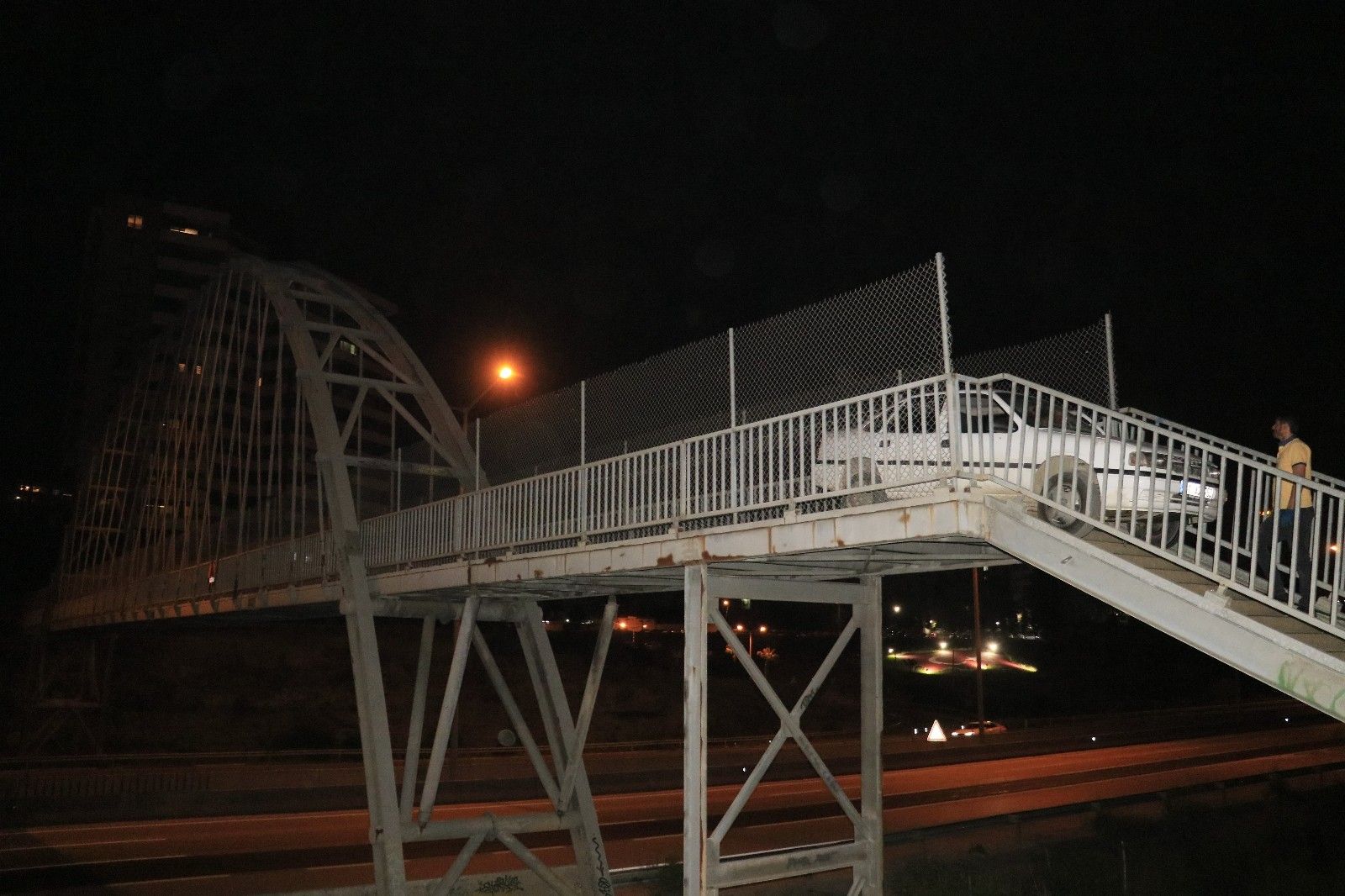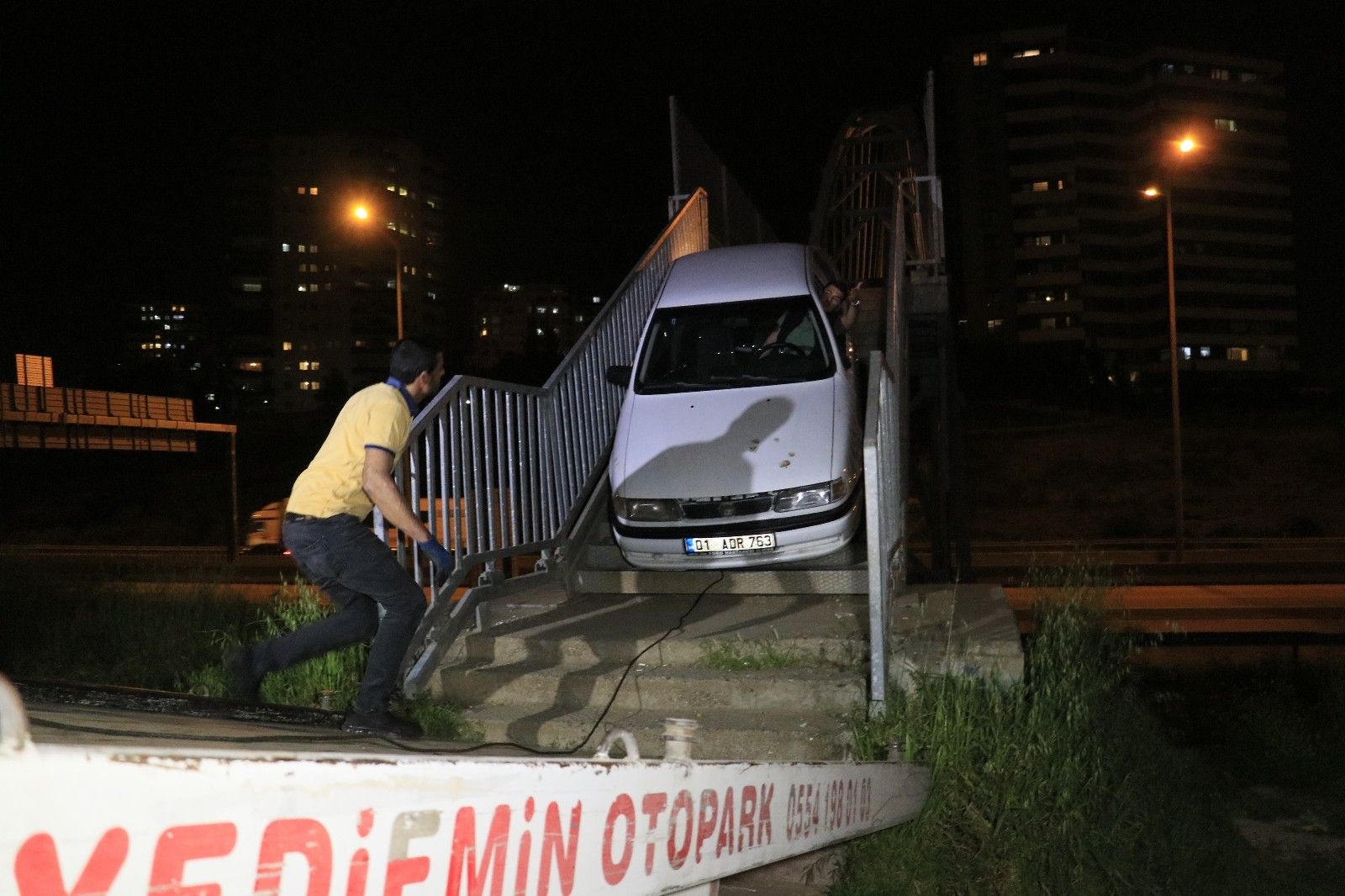 Olay, Seyhan ilçesine bağlı Yenibaraj Mahallesi'nde meydana geldi. Alınan bilgiye göre, yayaların otobanın üzerinden geçmek için kullandığı üst geçitten ismi öğrenilemeyen sürücü 01 ADR 763 plakalı otomobili ile geçmeye çalıştı. Bir süre ilerleyen sürücü köprünün korkuluklarına sıkıştı. Durumu gören vatandaşlar olayı polise bildirdi. Olay yerine gelen polis, araçta bulunan Sefer Ş. ile İbrahim S.'den hangisinin sürücü olduğunu sordu. Ancak iki şahısta aracı kullanmadıklarını belirtti. Polis iki şüpheliye sokağa çıkma yasağını ihlalden para cezası kesti. Otomobil ise bir saatlik çalışmanın ardından çekici yardımıyla yaya köprüsünden çıkartıldı.