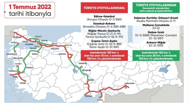 Kuzey Marmara otoyolunun Sakarya-Kurtköy-Odayeri-Kınalı bölümü, Malkara-Çanakkale, Gebze-İzmir/Menemen-Çandarlı, Ankara-Niğde otoyollarında ise 120 kilometre/saat olan hız sınırı 20 kilometre/saat artırılarak 140 kilometre/saate çıkarıldı.