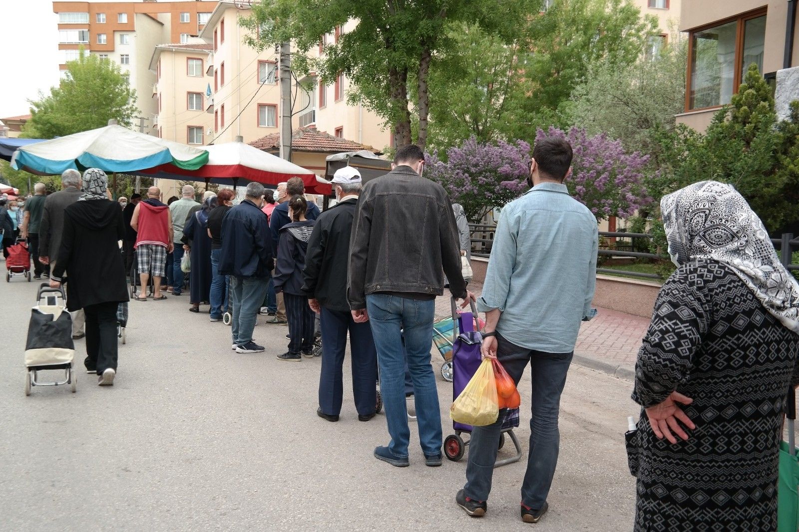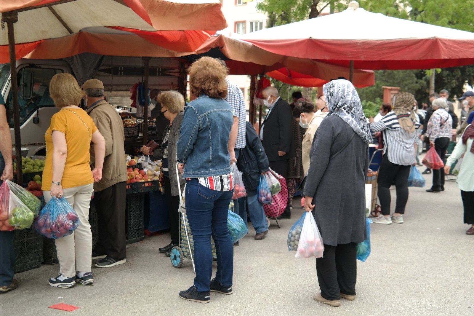 İçişleri Bakanlığının yayınladığı genelge ile kurulmasına izin verilen pazarlara gelen vatandaşlar tezgâhlar önünde yoğunluk oluşturdu.