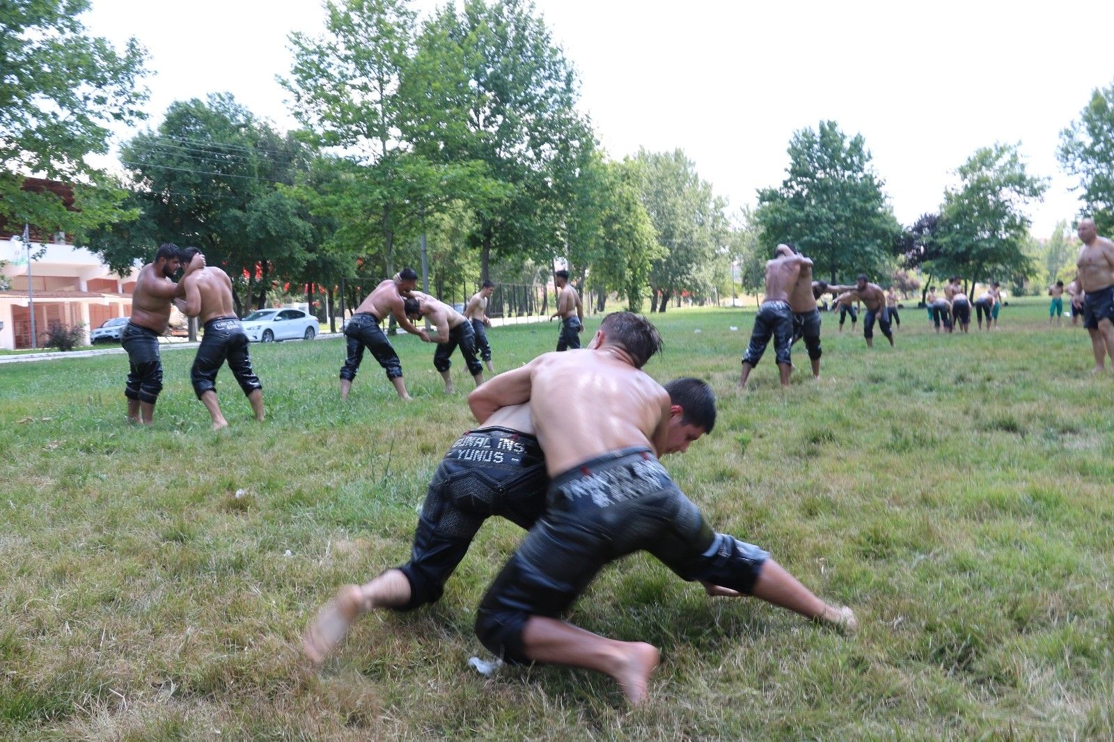 Korona virüs sürecinde evde antrenman yaparak bireysel performanslarını koruyan Edirneli pehlivanlar, 660. Tarihi Kırkpınar Yağlı Güreşleri'ne hazırlık için 35 derece sıcaklığa rağmen kispet bağlayıp çayıra çıktı.