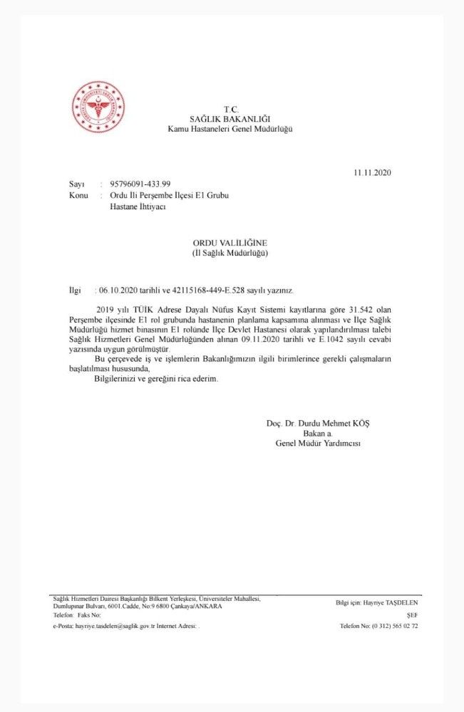 Perşembe ilçesine hastane müjdesi