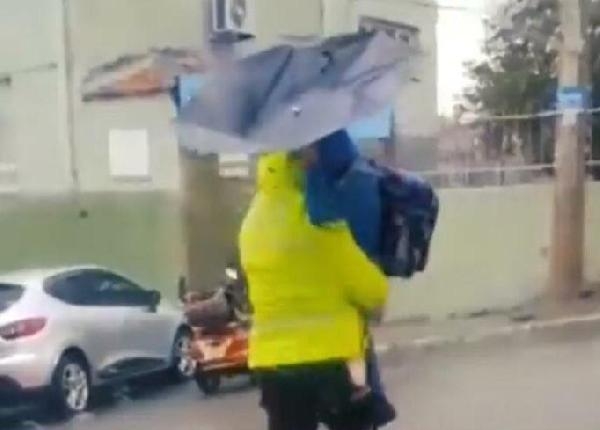 İZMİR'in Bayındır ilçesinde etkili olan rüzgar ve yağmur nedeniyle yürümekte zorlanan öğrenciyi, okulun önünde görev yapan trafik polisi kucağına alarak, yolun karşısına geçirdi.