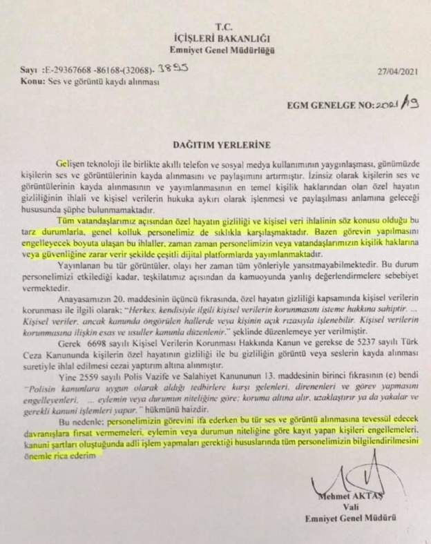 Emniyet Genel Müdürü Mehmet Aktaş'ın imzasıyla yayınlanan genelgede, görevli polislerin ve sivillerin ses ve görüntü kayıtlarının sosyal medyada paylaşılmasının, "özel hayatın gizliliğini ihlal ettiği", ses ve görüntü almanın da görevi yapmayı engellediği ifade ediliyor.