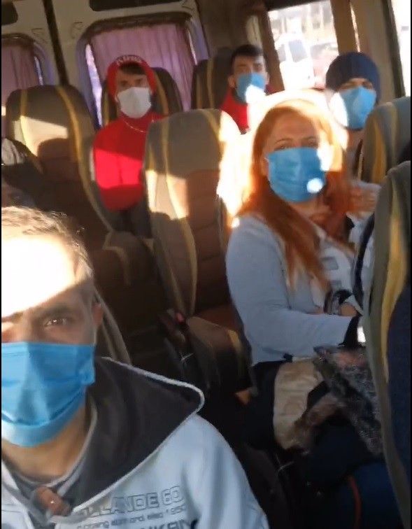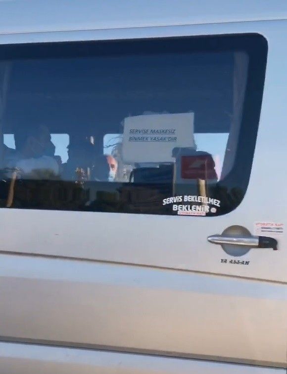 Gaziantep'te seyir halinde bulunan bir işçi servisinde yolcular, yanlarında seyir eden polis ekiplerini görünce maskelerine sarıldı. Üzerinde "maskesiz binilmez" uyarısının da bulunduğu aracı durduran ekipler, kuralları ihlal eden yolcu ve araç sürücüsüne ceza kesti.