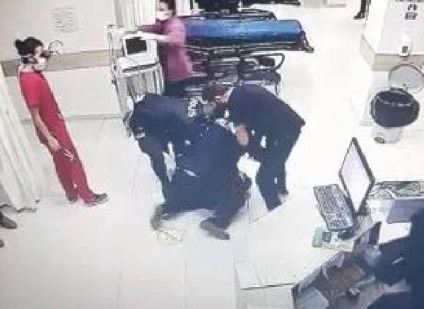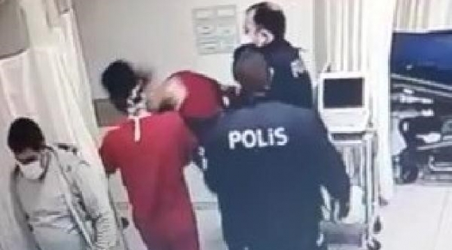 Polis eşliğinde elleri kelepçeli hastaneye getirilen Tahir D.'nin, kendisini kontrol etmek isteyen doktora kafa attığı anlar güvenlik kamerasına yansıdı. Polislerin şüpheliyi yatırarak etkisiz hale getirdiği anlar da kamerada yer aldı.