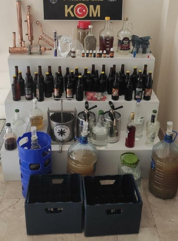 Muğla İl Emniyeti Kaçakçılık ve Organize Suçlarla Mücadele Şubesi Fethiye Grup Amirliği ekipleri, V.C.G.'nin (52) ürettiği sahte içkileri, yılbaşında piyasaya süreceği istihbaratına ulaştı. Şüphelinin evine düzenlenen operasyonda 86 litre sahte içki ve bakır parçalardan oluşan alkol damıtma düzeneği ele geçirildi. Gözaltına alınan V.C.G., polisteki işlemlerinin ardından savcının talimatıyla tutuksuz yargılanmak üzere serbest bırakıldı. (DHA)