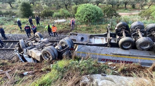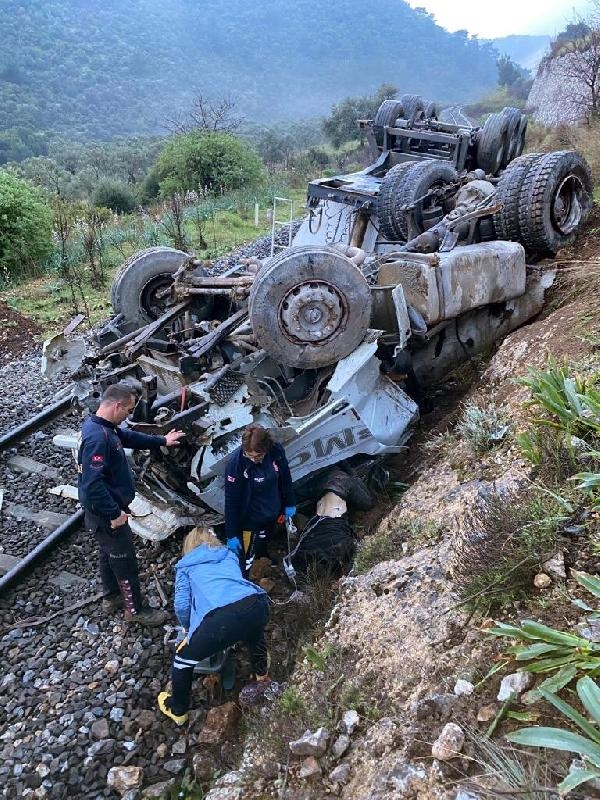 AYDIN'ın Germencik ilçesinde kontrolden çıkıp, raylara düşen hafriyat kamyonunun şoförü Adil Bozkurt (41), hayatını kaybetti.