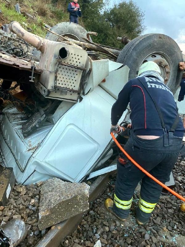 Raylara düşen hafriyat kamyonunun şoförü öldü