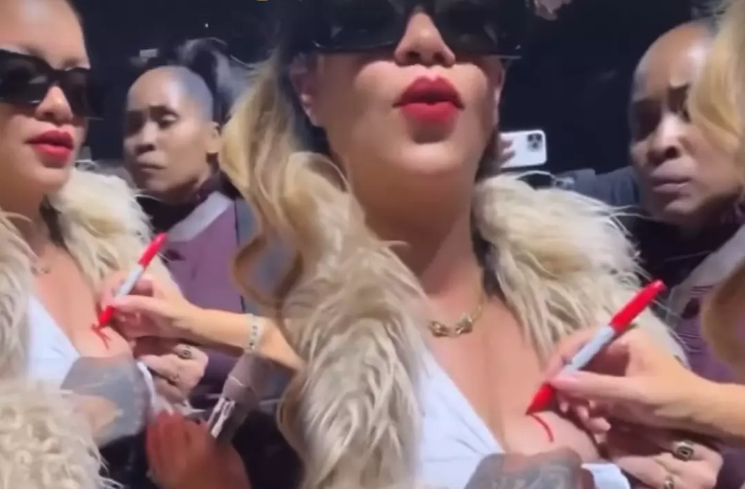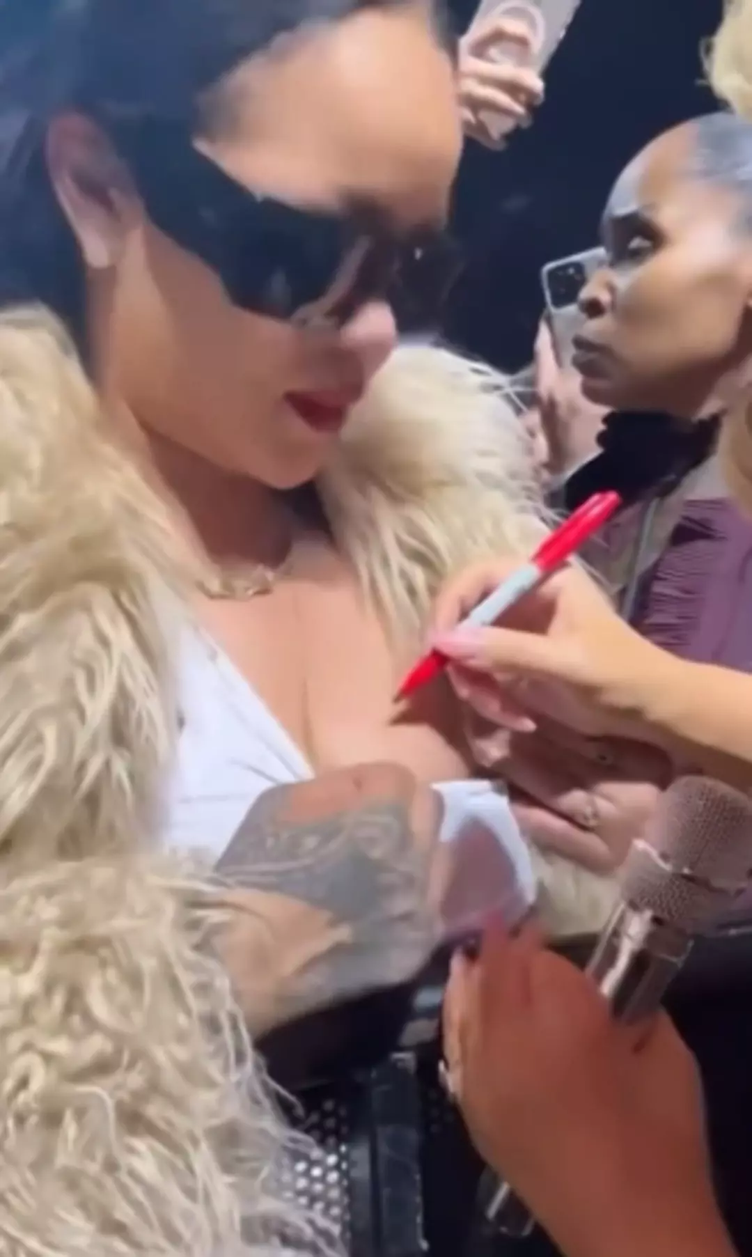55 yaşındaki şarkıcı, ünlü isim Rihanna'nın isteğini kırmadı ve sahneye çıkarak Rihanna'nın göğsüne imza attı.