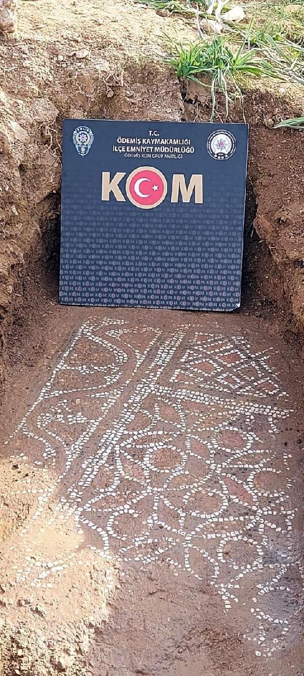 İZMİR'in Ödemiş ilçesinde dağlık arazide kaçak kazı yapan şüpheli, gün yüzüne çıkardığı Roma dönemine ait 6'ncı yüzyıldan kaldığı öne sürülen mozaik ile yakalandı. Kazı yapılan bölge koruma altına alındı.
