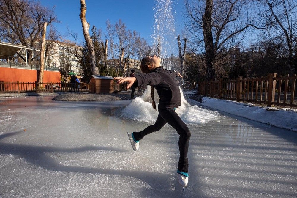 Başkent'te soğuktan dolayı buz tutan Ankara'nın simgelerinden Kuğulu Park, buz pateni antrenörü Türker Turhan ve öğrencilerine ev sahipliği yaptı. Ortaya Rusya'da, Kanada'da rastlanan görüntüler çıktı.