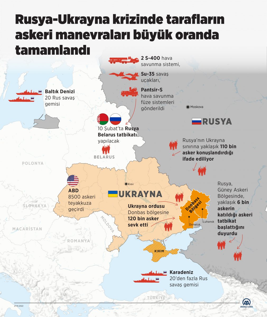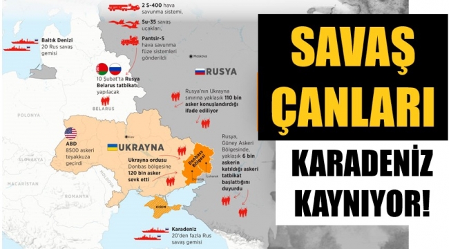 Rusya Savunma Bakanlığı, 20 savaş gemisinin askeri tatbikat için Baltık Denizi'ne, 20’den fazla savaş gemisinin ise Karadeniz’e girdiğini duyurdu. Ukrayna ordusunun ise Donbas temas hattı yakınına doğru 120 bin asker ve askeri teçhizatı sevk ettiği belirtiliyor.