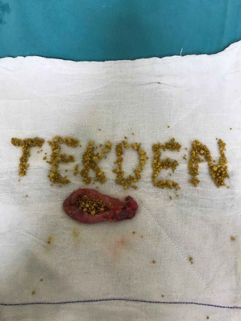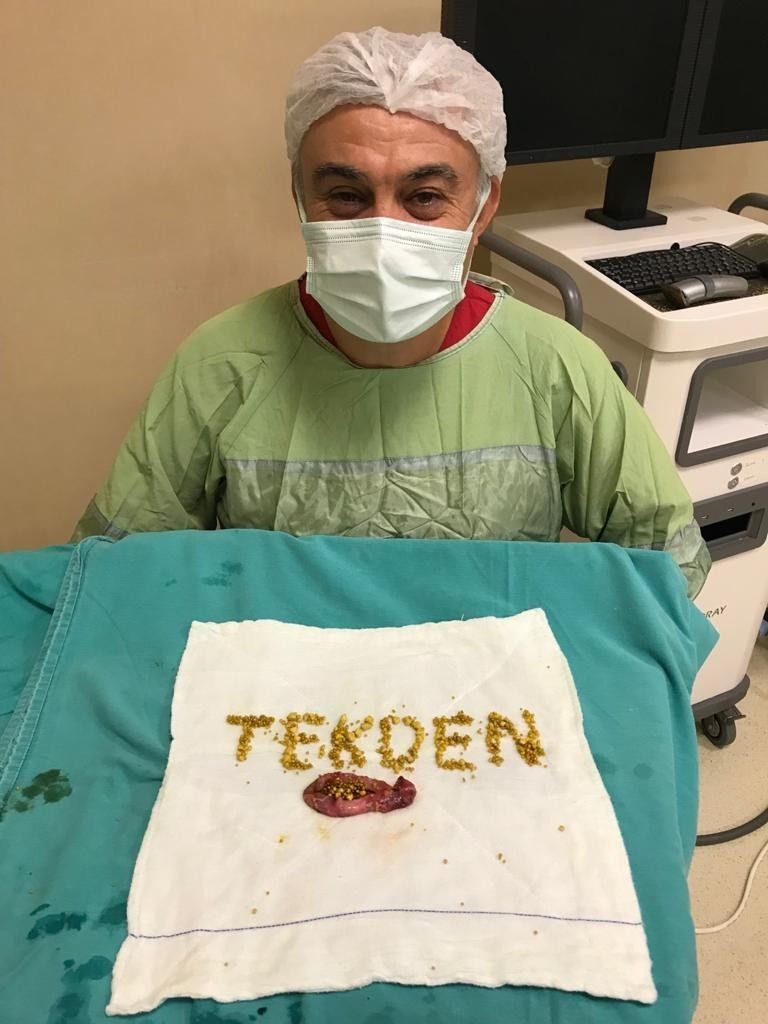 Karın ağrısı şikayetiyle gelen Damla, safra kesesinde taş olduğu anlaşılınca ameliyata karar verildi. Ameliyatta safra kesesinden yüzlerce taş çıktı. Damla'nın ameliyatını gerçekleştiren Genel Cerrahi uzmanı ve Başhekim Op. Dr. Mehmet Tekin, safra kesesinden çıkan taşlarla Tekden yazarak güzel bir görüntü ortaya çıkardı.