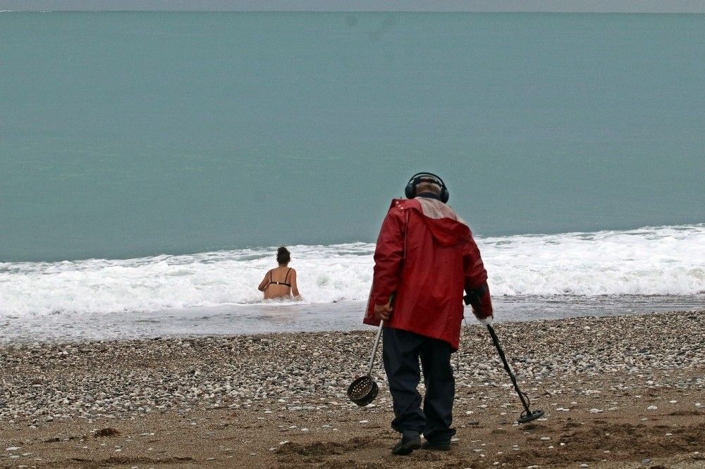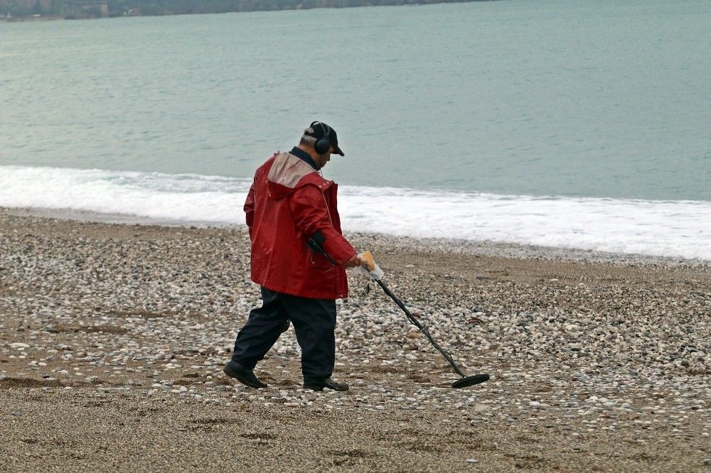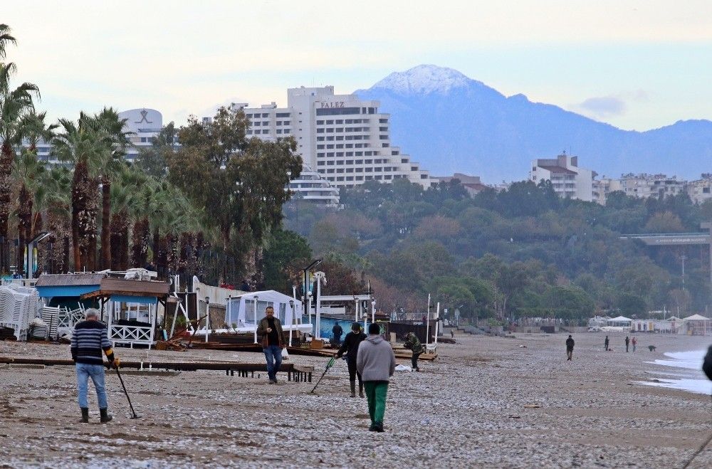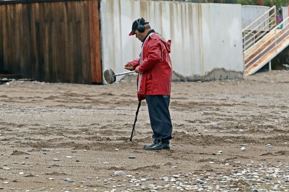 Antalya'da sağanak yağış sonrası dünyaca ünlü sahile gelen define avcıları, dedektörleriyle sahilde altın, gümüş ve madeni para aradı.