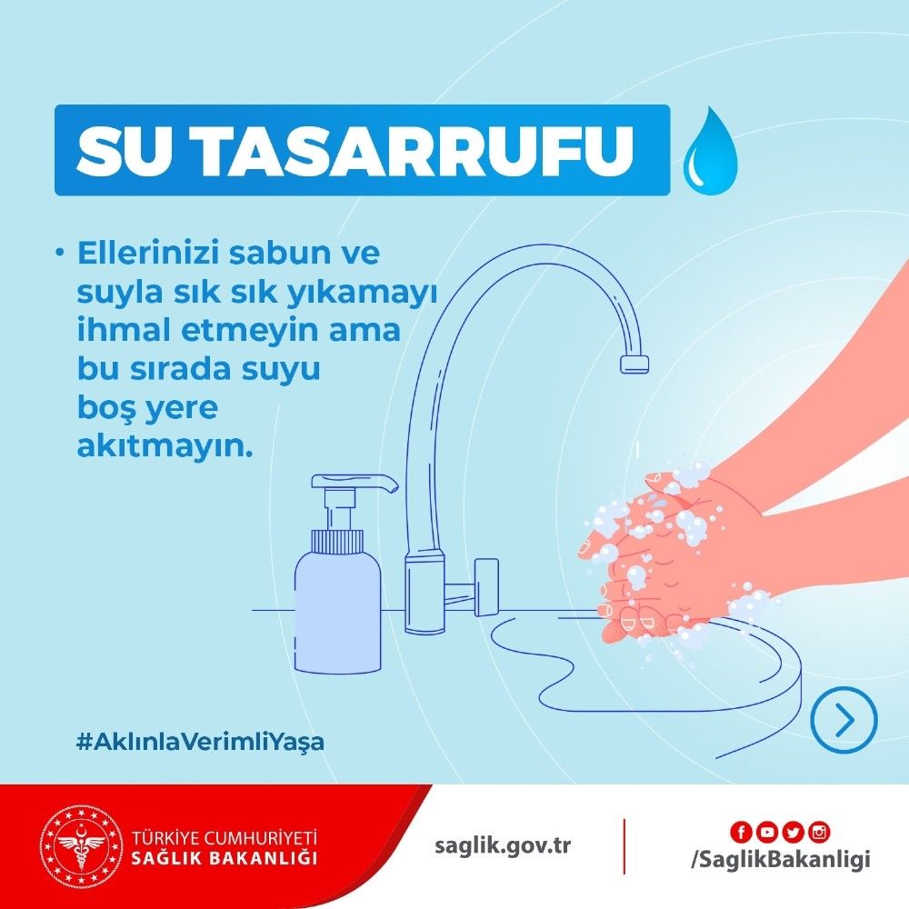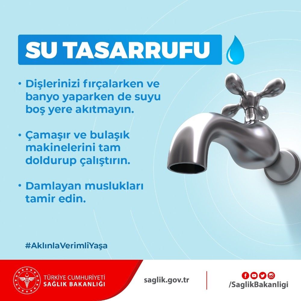 Sağlık Bakanlığı, sosyal paylaşım sitesi Twitter üzerinden su tasarrufu uyarısında bulundu. Bakanlık tarafından yapılan paylaşımda, su tasarrufu için yapılabilecekler yer aldı. Söz konusu paylaşımda, "Ellerinizi sabun ve suyla sık sık yıkamayı ihmal etmeyin ama bu sırada suyu boş yere akıtmayın. Su kaynaklarını doğru kullanarak kuraklıkla mücadele etmek için uygulanabilecek yöntemler: Ellerinizi sabun ve suyla sık sık yıkamayı ihmal etmeyin. Ama bu sırada suyu boş yere akıtmayın. Dişlerinizi fırçalarken ve banyo yaparken de suyu boş yere akıtmayın. Çamaşır ve bulaşık makinelerini tam doldurup çalıştırın. Damlayan muslukları tamir edin" ifadeleri yer aldı.