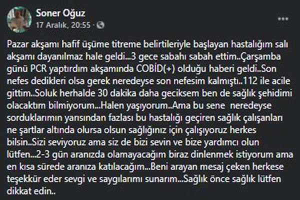 17 Aralık tarihinde yaptığı paylaşımla "Ben de sağlık şehidi mi olacaktım" sözlerini yazan Oğuz, "Pazar akşamı hafif üşüme titreme belirtileriyle başlayan hastalığım salı akşamı dayanılmaz hale geldi 3 gece sabahı sabah ettim. Çarşamba günü PCR yaptırdım akşamında korona virüs olduğu haberi geldi. Son nefes dedikleri olsa gerek neredeyse son nefesim kalmıştı. 112 ile acile gittim. Soluk herhalde 30 dakika daha geciksem ben de sağlık şehidi mi olacaktım bilmiyorum. Halen yaşıyorum. Ama bu sene neredeyse sorduklarımın yarısından fazlası bu hastalığı geçiren sağlık çalışanları. Ne şartlar altında olursa olsun sağlığınız için çalışıyoruz herkes bilsin. Sizi seviyoruz ama siz de bizi sevin ve bize yardımcı olun lütfen. 2-3 gün aranızda olamayacağım biraz dinlenmek istiyorum ama en kısa sürede aranıza katılacağım. Beni arayan mesaj çeken herkese teşekkür eder sevgi ve saygılarımı sunarım. Sağlık önce sağlık lütfen dikkat edin" diye paylaşımda bulundu.