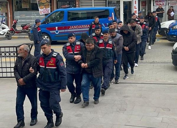 MANİSA ve İzmir'de jandarmanın suç örgütüne yönelik düzenlediği operasyonda, gözaltına alınıp, adliyeye sevk edilen 27 şüpheliden 25'i tutuklandı. Diğer 14 şüphelini jandarmadaki işlemlerinin sürdüğü bildirildi.