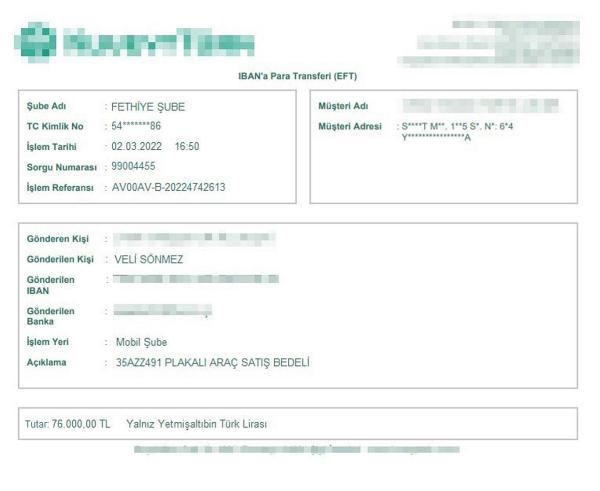 Otomobilden anladığını söyleyen ikili, araç ekspertiz raporuna gerek olmadığını belirtip kontrolleri kendileri yaptı. 76 bin lira satış fiyatına anlaşan otomobilin sahibi Sönmez ile alıcı Yaşar D. ve İsa K., otomobilin satışı için Karabağlar'da notere gitti. İsa K. dışarıda beklerken Yaşar D. ile Sönmez satış işlemleri için notere girdi. Sönmez'e 76 bin liranın İBAN üzerinden EFT yapıldığı söylendi. Banka hesabını kontrol eden Sönmez, hesabına paranın aktarılmadığını görüp bu sırada dışarıda bekleyen İsa K.'ye durumu bildirdi. İsa K., Sönmez'e dekontu mesaj olarak gönderip, paranın miktarı yüksek olduğu için işlemlerin gecikebileceğini söyledi. İsa K.'nin söylediklerine inan Sönmez, noterdeki işlemleri tamamlayıp aracın satışını gerçekleştirdi.