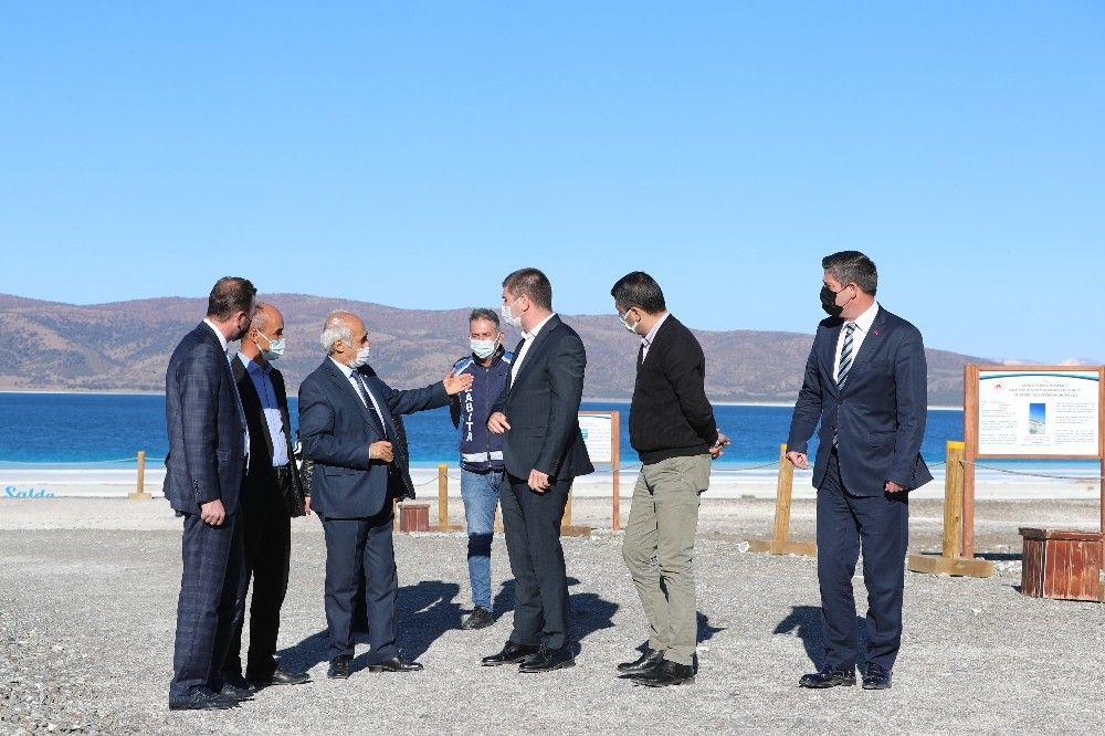Burdur Belediye Başkanı Ali Orkun Ercengiz, Yeşilova Belediye Başkanı Mümtaz Şenel, Belediye Başkan Yardımcısı Ali Say, CHP Merkez İlçe Başkanı Serkan Şimşek ve İl Genel Meclis Üyesi Nurettin Korkmaz ile birlikte Türkiye'nin Maldivleri Salda Gölü'nü gezdi. Göldeki çekilmeyi inceleyen Başkan Ercengiz, vatandaşların su kullanımına dikkat etmesi gerektiği konusunda uyarıda bulundu. Yağışların az olması nedeniyle çekilmeler meydana gelen Salda Gölü ile alakalı tedbirlerin alınması gerektiğini belirten Başkan Ercengiz, taban sularının göle kavuşması için elinden geleni yapacağını söyledi. Ercengiz, "Bugün Yeşilova ilçemizdeyiz. Geçtiğimiz günlerin ana gündem maddelerinde birisi de Salda Gölü'ndeki çekilme idi. Bugün başkanımızı ziyaret ederken Salda Gölü'nü de görmeden gitmek istemedik. Mevsimsel kuraklığın artmış olması bu yıl kar yağışının bugün itibariyle istediğimiz oranda olmaması özellikle taban suyu ile beslenen Salda Gölü'müzün bu yıl bir miktar çekilmesine sebep olmuş gibi gözüküyor. Bu bizim için endişe vericidir. Suyumuzu her fırsatta daha iktisatlı daha doğru kullanmamız gerektiğini gösterir" diyerek bölgedeki suların göle kavuşması için yapılacak adımları dikkatle takip edeceğini ifade etti.