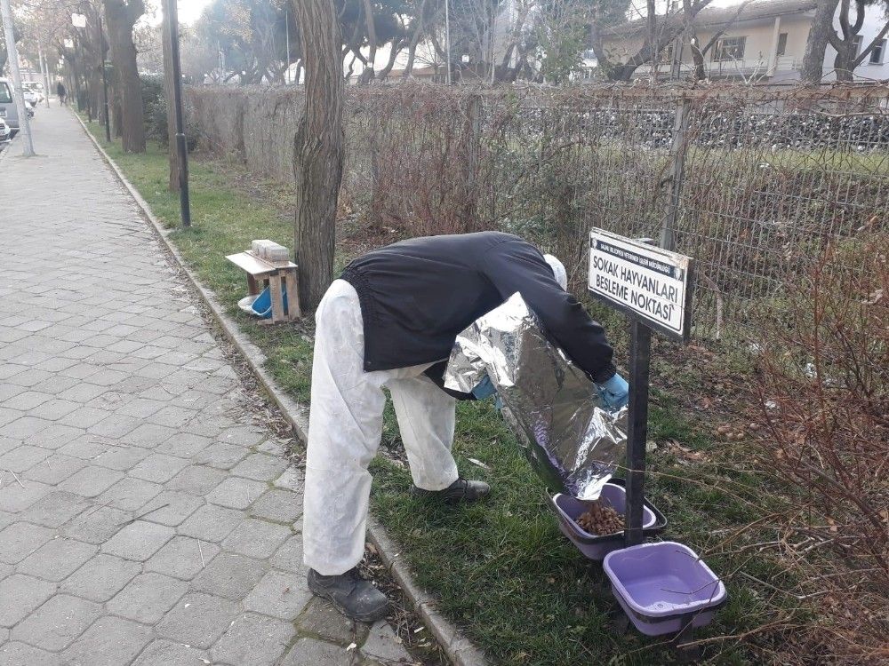 Belediye Veteriner İşleri Müdürlüğüne bağlı ekipler, sokağa çıkma kısıtlamasında sokakta yaşayan kedi ve köpekler için şehrin dört bir yanında besleme çalışmaları yaparak can dostlara mama ve su dağıtımı gerçekleştirdi.