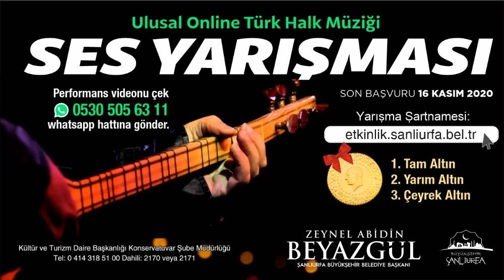 Şanlıurfa Büyükşehir Belediyesi, sesine ve yeteneğine güvenen vatandaşlara yönelik ödüllü 'Ulusal Online Türk Halk Müziği Ses Yarışması' ve 'Ulusal Online Tiyatro Yarışması' düzenliyor