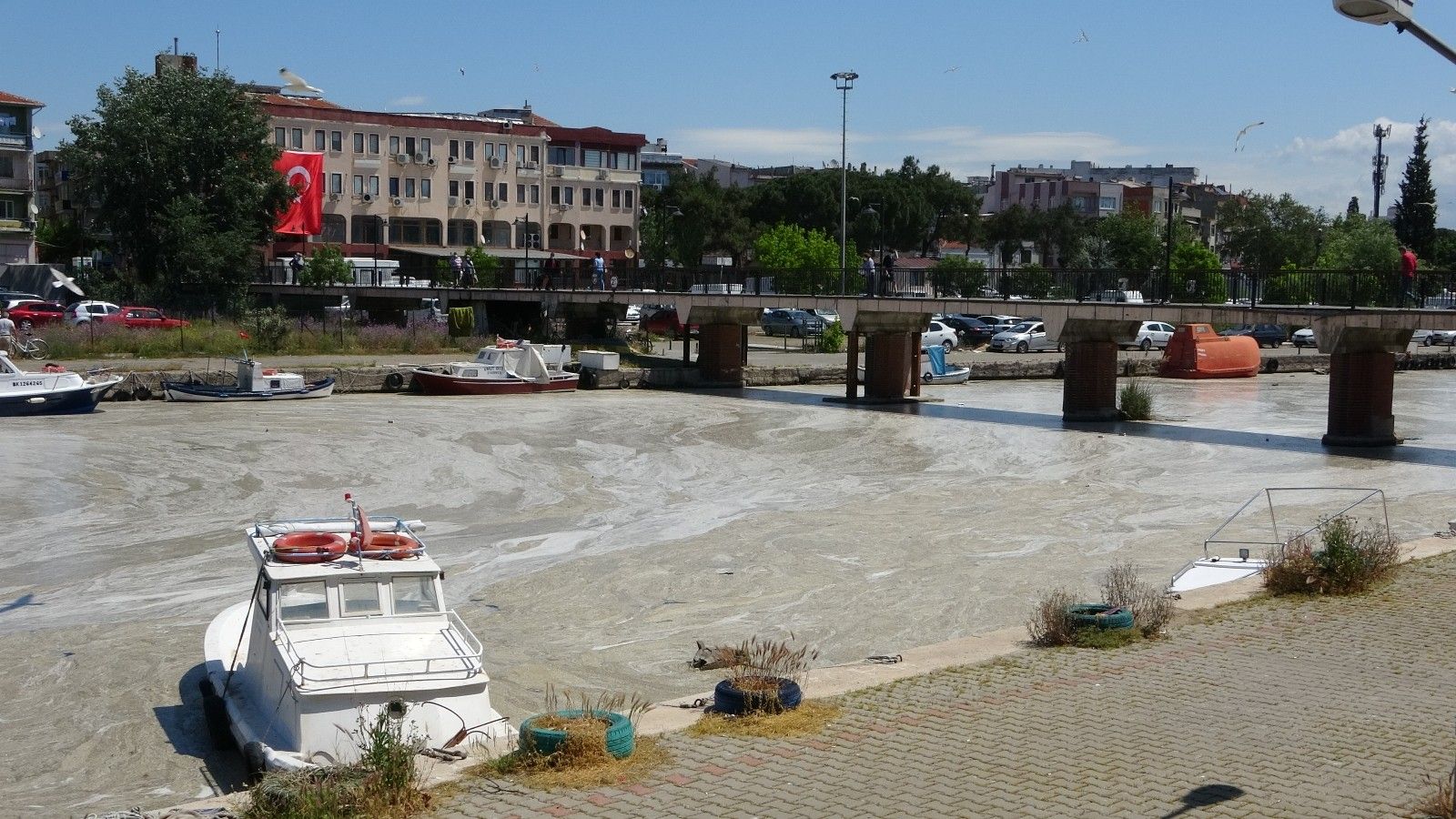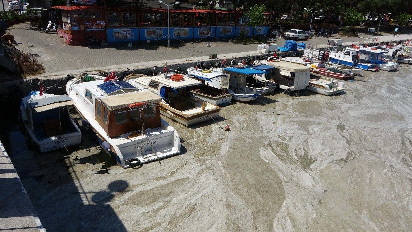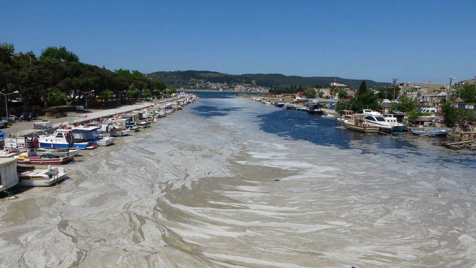 Çanakkale'de kenti ortadan ikiye bölen Sarıçay, müsilaja (deniz salyasına) teslim oldu. Balıkçı barınağı olarak da kullanılan çaydaki yapışkan tabaka üzerinde bulunan çöpler görenleri tedirgin ediyor.