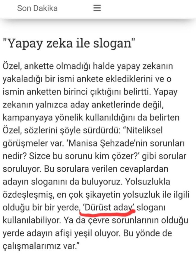 CHP’nin İzmir’de aday ve slogan belirlerken yapay zekaya sordukları soruların doğru olduğunu ama aldıkları yanıtların kendilerini işaret ettiğini göremediklerini belirten AK Parti İzmir İl Başkanı Bilal Saygılı, konuya ilişkin şunları söyledi; “Halka sorulası gerekeni, yapay zekaya sormuşlar. Hadi sordular, yapay zekâ mucizesini yok sayacak değiliz. Ama; aldıkları yolsuzluk şikâyeti olan yerlerle ilgili yanıtları hiç üstlerine alınmadan açıklama yapıyorlar. Maharetmiş gibi de “doğru-dürüst” sloganını buna göre belirlediklerini söylüyorlar. Şaka gibi gerçekten. Bu ne demek? Kendilerinin İzmir’i, Büyükşehir Belediye Başkan Adayları Cemil Tugay’ın son 5 yıl Karşıyaka’yı yönettiği yerde ‘yolsuzluk’ şikâyeti var demek. Doğru, Dürüst tarifine kendileri yüzünden ihtiyaç duymuşlar demek. Bu ne demek? Tugay’ın selefi Tunç Soyer, daha önceki başkanları Aziz Kocaoğlu ‘doğru-dürüst değildi’ demek. CHP’nin İzmir’de aynaya bakma alışkanlığı zaten hiç yoktu; yapay zekâ onlara acı gerçeği sunmuş, bu kez de üstlerine hiç alınmamışlar.”