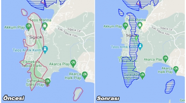 Yine geçtiğimiz günlerde Resmi Gazete’de yer alan duyuru ile birlikte Sığacak ilçesindeki 1’inci derece doğal SİT bölgesinde değişikliğe gidilmişti. Bölgedeki bazı bölgelerin tamamen SİT özelliği kaldırılırken bazı bölgelerinde SİT dereceleri 2’ye ve 3’e düşürülmüştü. Özellikle deniz kenarındaki bölgelerin SİT özelliğinin kaldırılarak bu bölgelerin yapılaşmaya açılması dikkat çekmişti. (Egedesonsöz)