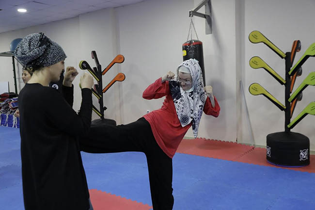 Taekwondo Antrenörü Sabah Vural tarafından verilen eğitimin ilk bölümünde ısınma ve açma germe hareketleri, ikinci bölümünde ise öz savunma teknikleri öğretiliyor.