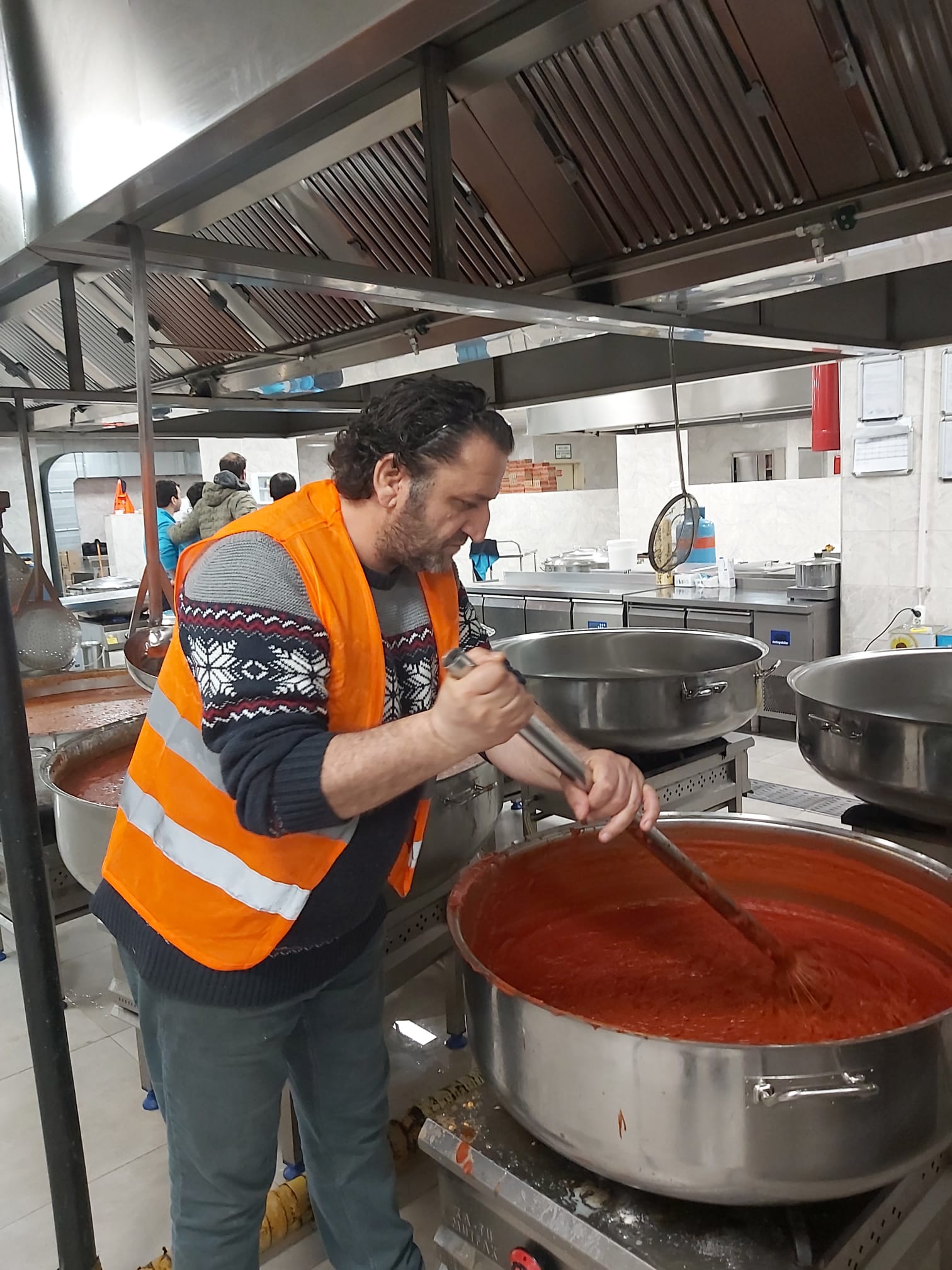 "Gaziantep'ten Kahramanmaraş'a geçtik. Buradan da bize Afşin ilçesinde bulunan Kredi ve Yurtlar Kurumu Kız Öğrenci Yurdu'na geçmemiz istendi. Yurdun mutfağı bize tahsis edildi. 10 kişilip bir ekiple her gün sıcak yemek çıkarıyor, depremzedelere dağıtıyoruz. Ekibimde Hakan Baguç, Sertaç Tanrıverdi, Kadir Dura ile Türkiye'nin değişik ilçelerinden şefler var."