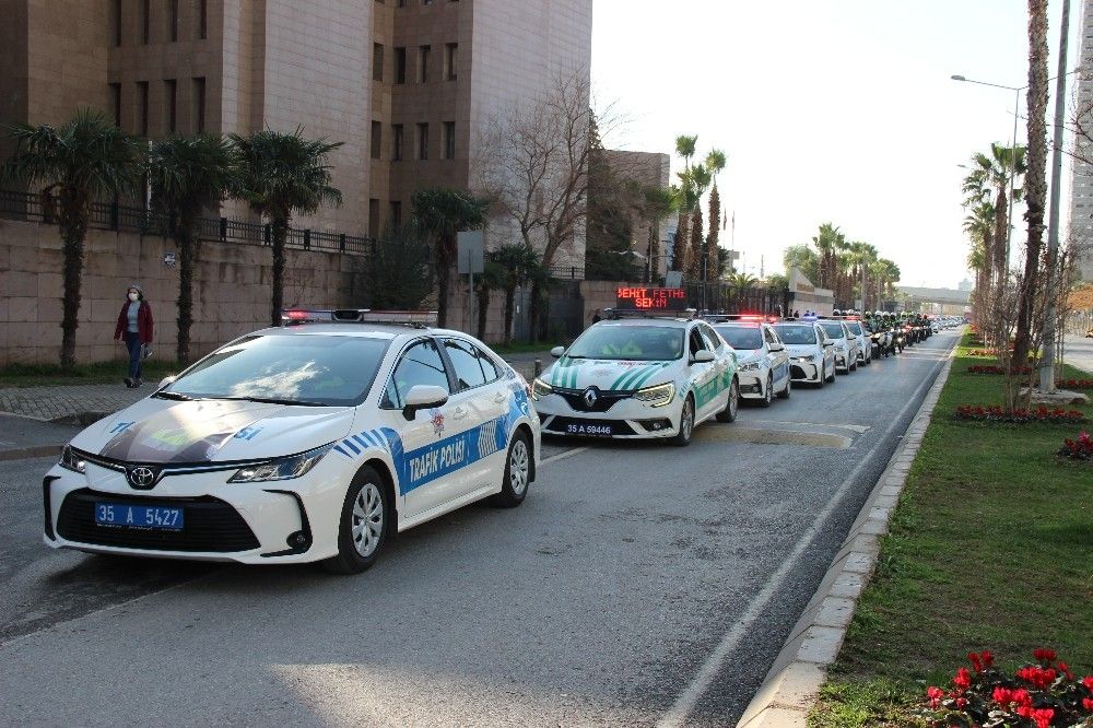 İzmir Adliyesine yönelik düzenlenen terör saldırısında 4 yıl önce şehit düşen polis memuru Fethi Sekin için mesai arkadaşları tarafından 50 araçlık kortej oluşturuldu. Konvoyu gören İzmirliler, o anları cep telefonu kameralarına kaydetti.