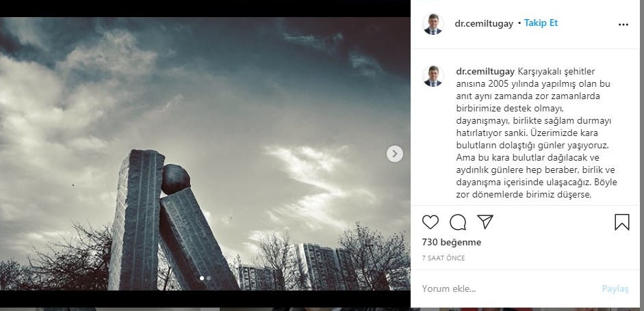 Bu konuda vatandaştan gelen şikayetleri kulak arkası ettiği belirtilen Karşıyaka Belediyesi, dalga geçer gibi bugün sosyal medya hesabından paylaşımda bulundu. Hem belediyenin resmi instagram hesabından hem de Belediye Başkanı Cemil Tugay'ın instagramından bu anıtın fotoğrafı yayınlandı. Ama anıtın yok edilmiş alt kısmı değil sadece üst bölümü gözükürken fotoğrafın altında şu yazı paylaşıldı: