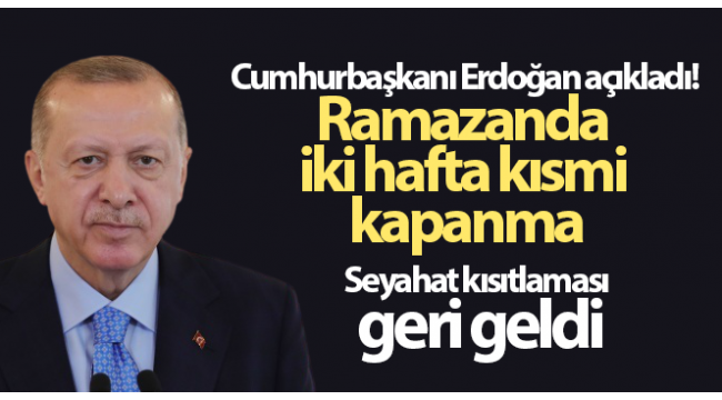 Kabine toplantısı sonrası açıklama yapan Cumhurbaşkanı Erdoğan, Ramazan ayının ilk iki haftasında kısmi kapanma kararı alındığını duyurdu. Hafta içi sokağa çıkma yasağının saatinin değiştiğini duyuran Erdoğan, şehirler arası seyahatlerle ilgili alınan kararı da açıkladı.
