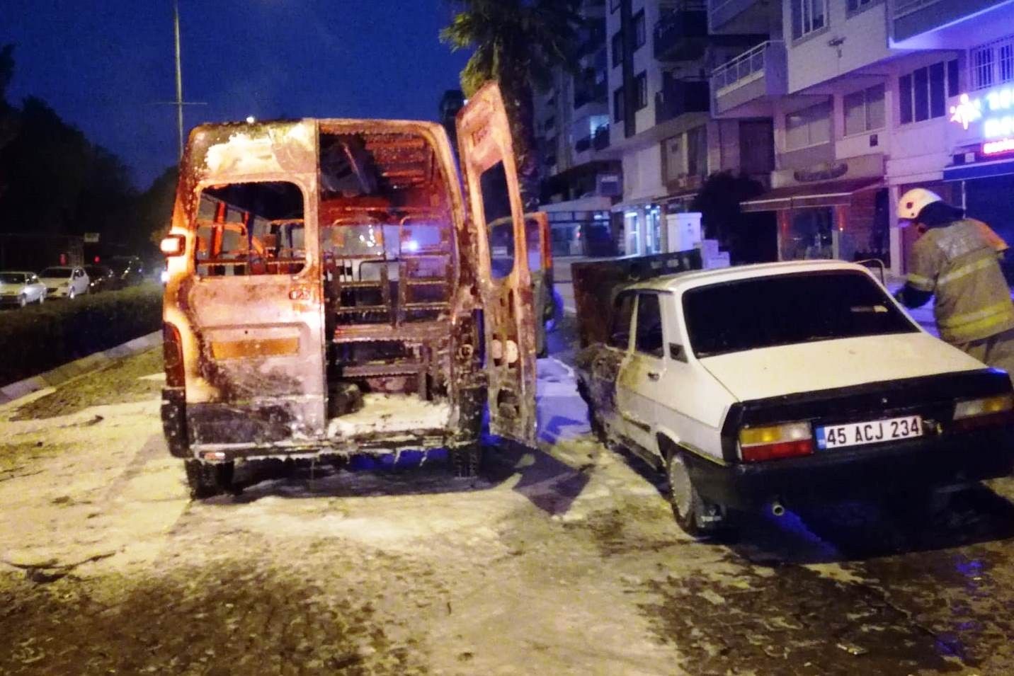 İzmir'in Bergama ilçesinde seyir halindeki bir minibüste çıkan yangın, park halindeki iki otomobilde de hasara yol açtı.